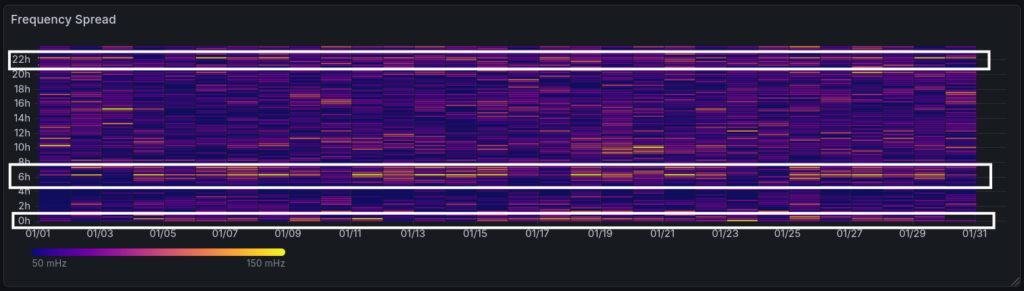 In this graph, I want to show the frequency spread (max-min in 15min intervals) for visualising common patterns. As long known, the most frequency span are in the morning hours, at the evening and around midnight, mostly due to market impact.