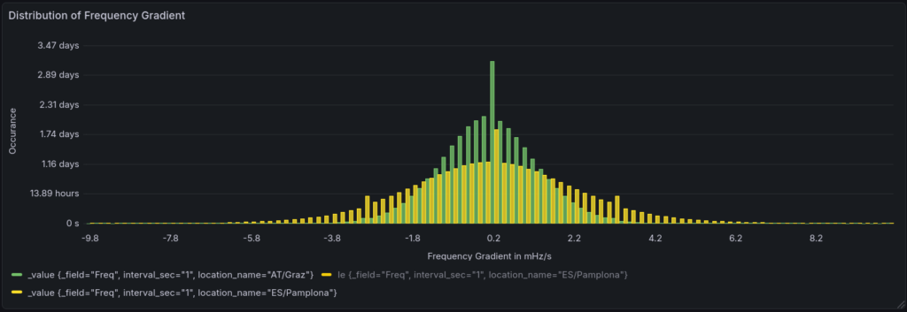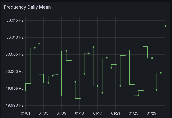 The daily mean can give you an overview of the „accuracy“ of the grid control and their effect on grid synchronized clocks. Until the event on 31st of January, the average was 50.0000 Hz but resulted in whole January mean of 50.0005 Hz which can be also written as 27 seconds fast of time.