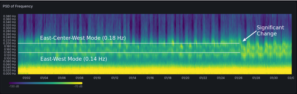 There was a change in characteristics on the 26th of January. Both modes rose in magnitude and the east-center-west mode dropped in frequency. An explanation can be found in the power flow in Spain.