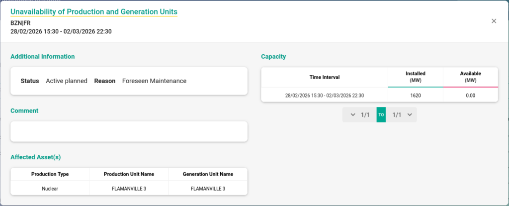 2026-02-28 14:30:28 (UTC): Loss of generation in France: FLAMANVILLE 3 (1620 MW) was noted in transparency.entsoe.eu as Foreseen Maintenance, but the frequency „says“ hard loss:
