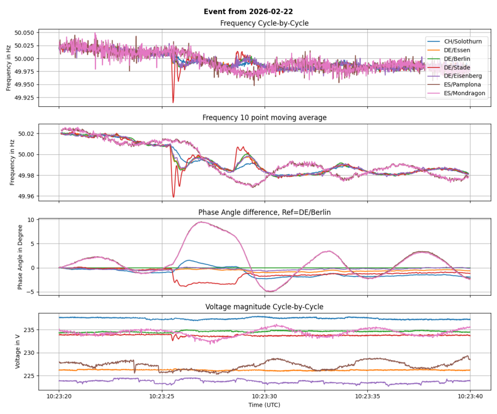 2026-02-22 09:23:26 (UTC): Short loss of generation in northern Germany (DE/Stade is in different color than in the last graph because no data from AT/Graz)