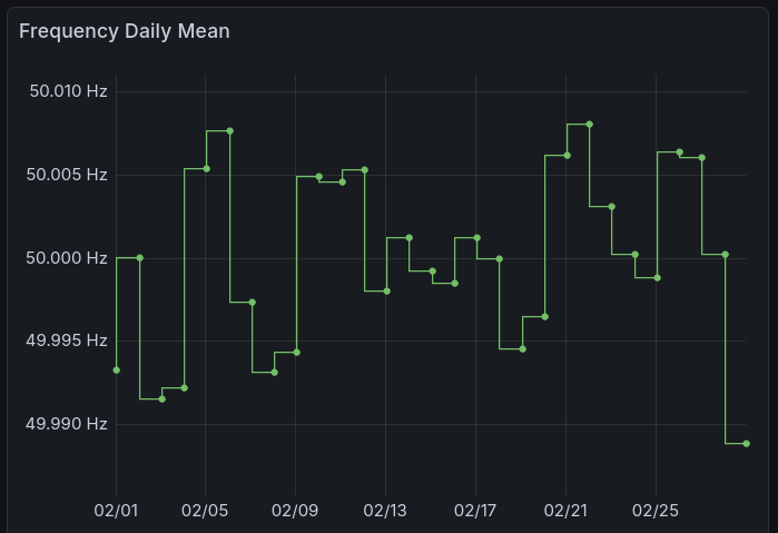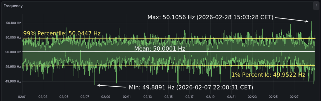 The daily mean can give you an overview of the „accuracy“ of the grid control and their effect on grid synchronized clocks. Until one day before the end of the month, the average was 50.0004 Hz but resulted in whole February mean of 50.0001 Hz which can be also written as 4.8 seconds fast of time.