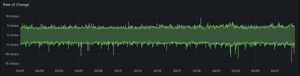 ROCOF of CH/Solothurn: Most of the time between +-5mHz/s with some significant outlier in negative direction.