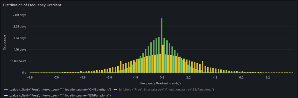 Histogramm of the ROCOF from CH/Solothurn (green) and ES/Pamplona (yellow) in comparison. One can see, the distribution is much wider in Spain than in middle Europe, which is a result of the more significant inter-area oscillations.