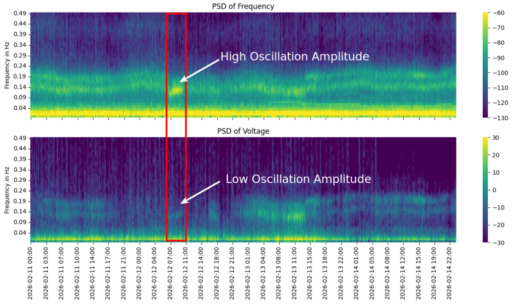 An interesting detail comes to eyes in comparison with the voltage magnitude oscillation. Typically, the voltage is also oscillating with the same frequency, but in the problematic time frame, the behaviour was different. One reason could be, that the power oscillation damping system (POD) was not working properly, these systems mainly adapt the voltage magnitude by changing reactive power (POD-Q).
