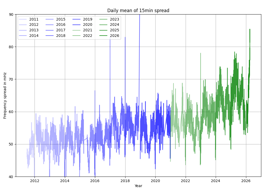 Für die Langzeitanalyse habe ich die „Einhüllende“ pro Viertelstunde berechnet und daraus den täglichen Mittelwert des Spreads ermittelt. Das gibt uns ein präzises Bild davon, wie viel „Fläche“ die Frequenzkurve pro Tag einnimmt.