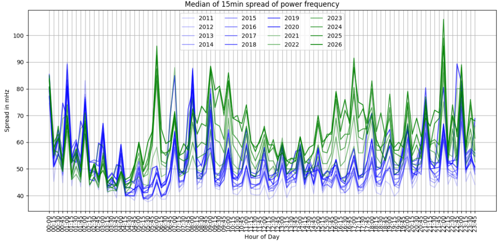 Vergleicht man den Median-Tagesverlauf der Jahre, sieht man ab 2021 einen deutlichen Anstieg der Schwankungen (Spreads) – vor allem am Vormittag und am späten Nachmittag. In den Nachtstunden ist das Netz hingegen sogar etwas ruhiger geworden als früher.