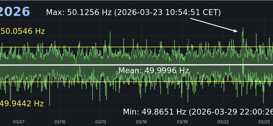 Welcome to the third report this year of the data acquired with the PQopen measurement network. Summary In the summary, the 1s-mean value of the mains frequency is evaluated. Statistics… Weiterlesen »Grid Frequency Report 03-2026